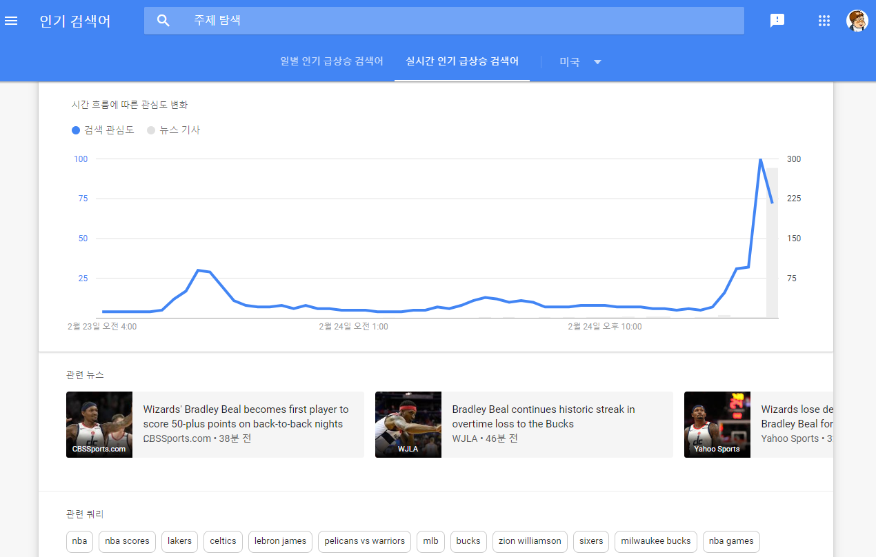인기 급상승 검색어 메뉴를 들어가면 두개의 탭으로 구성된 화면을 확인할 수 있다.