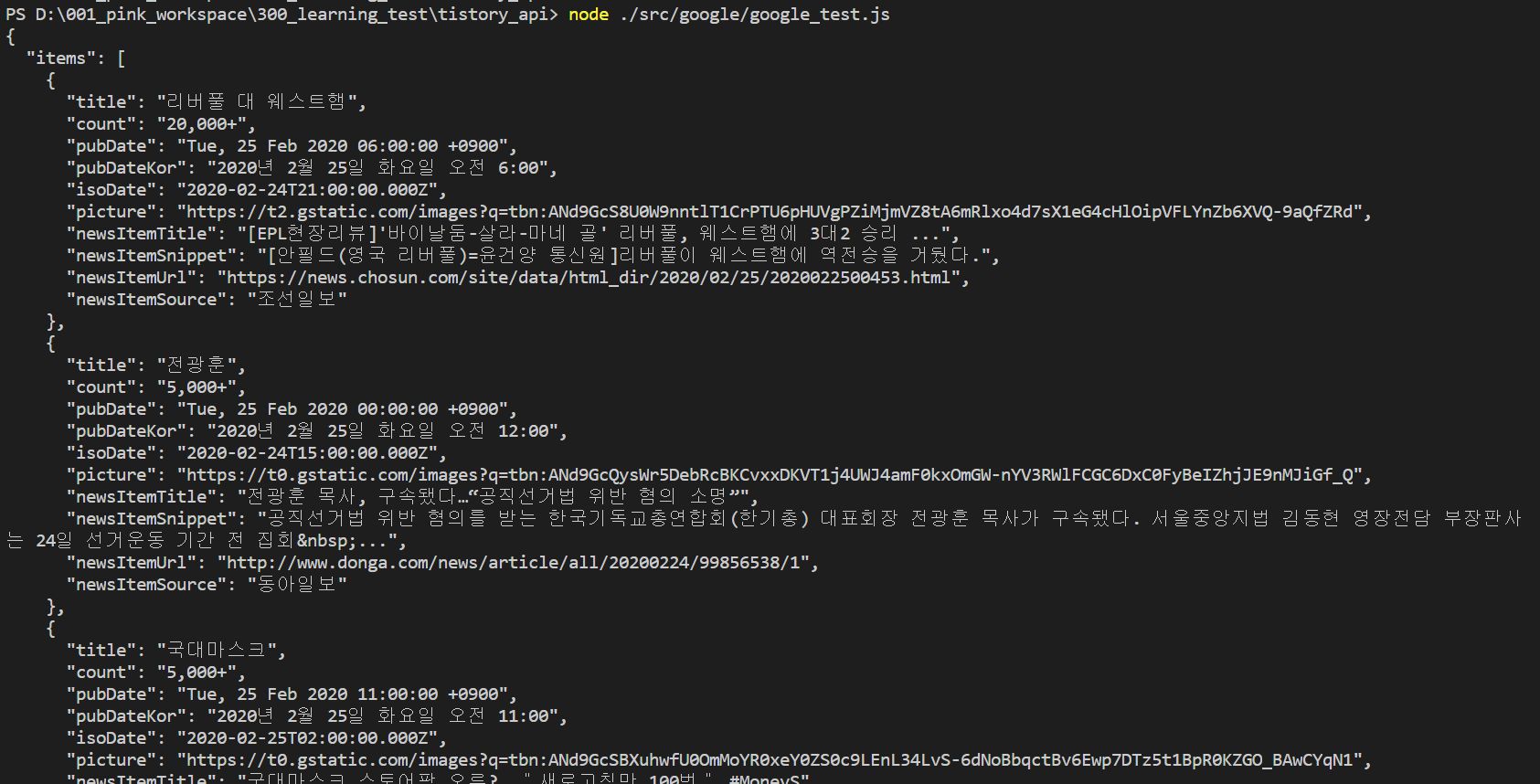 아래 코드로 실행해 보면 정상적으로 데이터를 가져와 출력하는 것을 확인할 수 있다.(고마워요 RSS~)