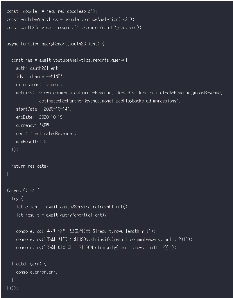 (인증 관련 자세한 내용은 “유튜브(Youtube) API — 5.인증받고 사용하기” 글을 참고한다.)2. 수익 Top5 동영상 목록 조회