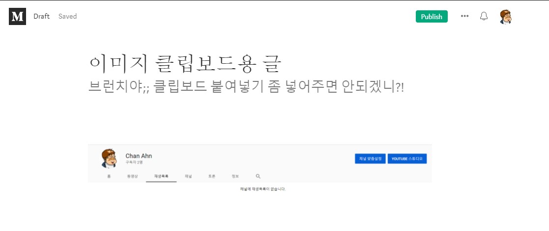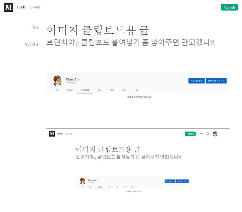미디엄에 작성한 클립보드용 임시 글 2. 캡처한 이미지를 1번의 에디터에서 Ctrl+V 신공(Windows+V를 더 추천한다.)을 이용해서 추가한다.