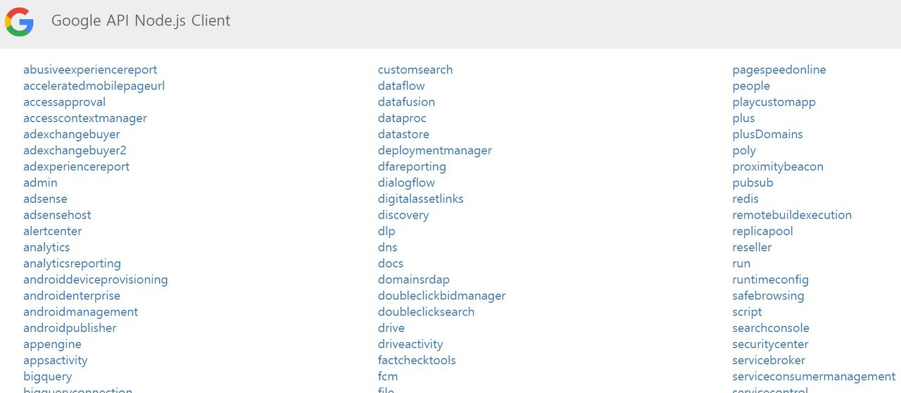 https://googleapis.dev/nodejs/googleapis/latest/ 그밖에 다양한 언어를 사용한 라이브러리들도 제공하고 있으니, 한 번쯤 살펴보기 바란다.