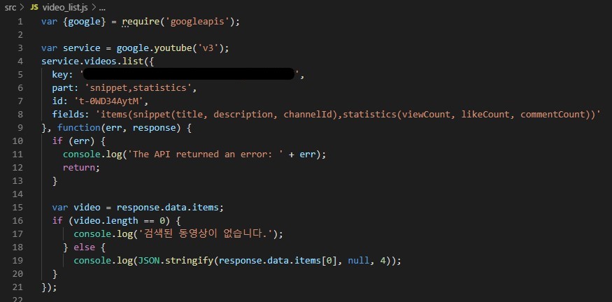 인자로 사전작업에서 설정한 API 키 값을 설정하고, 조회하고자 하는 동영상의 아이디와 속성정보를 넘겨주면 된다. 실행시켜 결과를 보자.