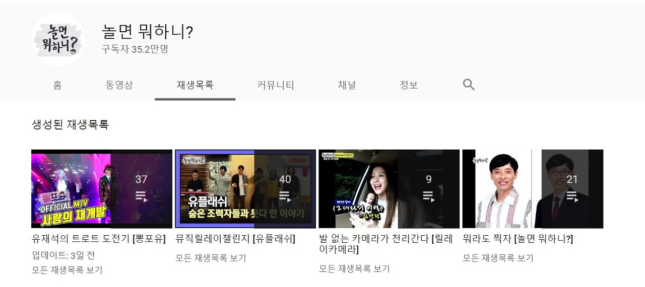 시나리오. '놀면뭐하니?' 채널에 등록된 재생목록들의 제목과 설명 그리고 대표 이미지를 출력한다.