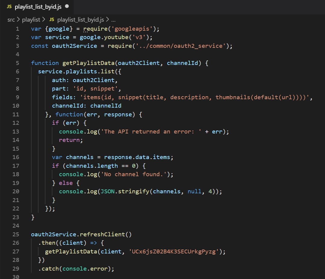 재생목록 정보를 출력하는 코드 5. 인증받고 사용하기 글에서 작성해놓은 OAuth2 클래스를 활용해서 권한 관련 코드가 깔끔하게 정리됐다. playlists 클래스의 list 메서드를 사용한다. 해당 메서드 인자의 id 속성에 '놀면뭐하니?' 채널 아이디를 설정하고 3.API 살펴보기 글에서 설명했던 part와 fields 속성을 통해 시나리오에서 원했던 값들만 얻어왔다.