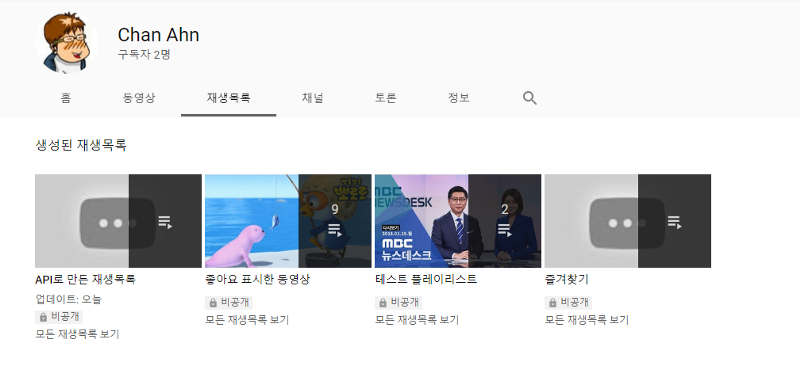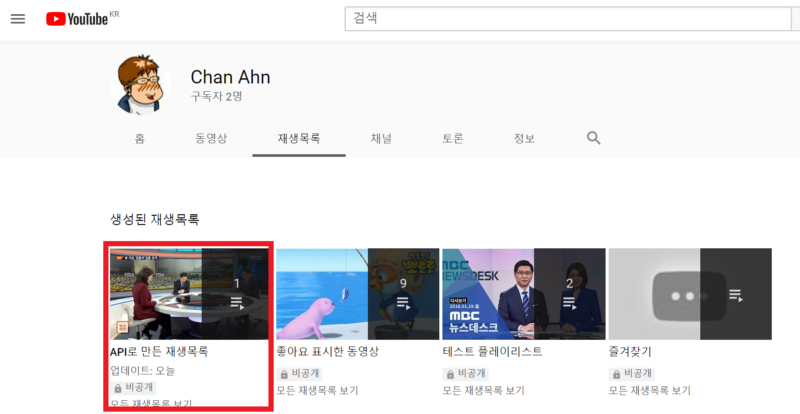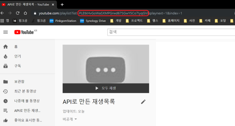 1. 유튜브에서 내 채널의 "API로 만든 재생목록" 재생목록 아이디(PLEtkHvGoWaSXMPGrwd67SGwY5Co7IyqGV)를 확인한다.
