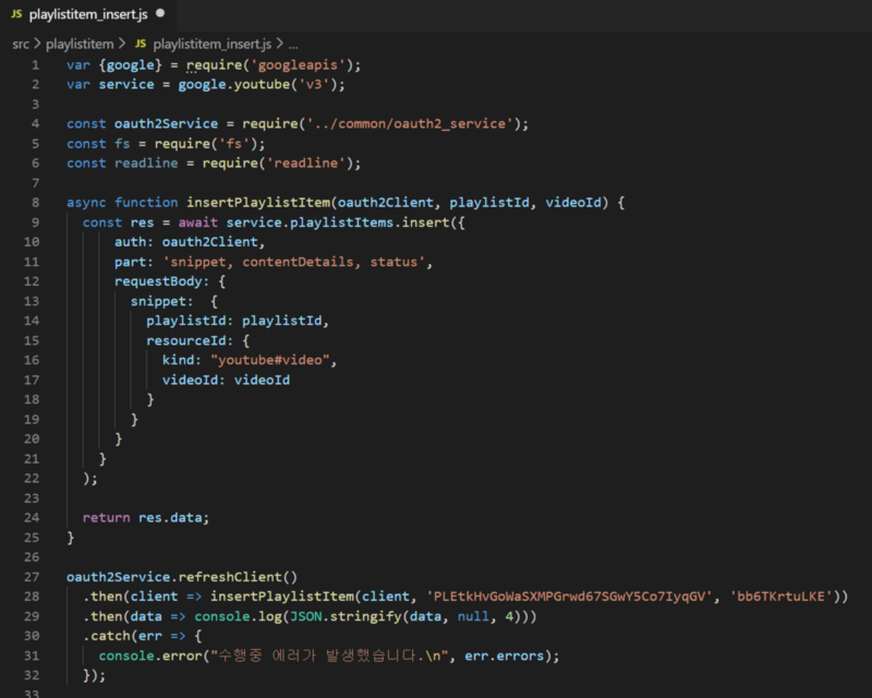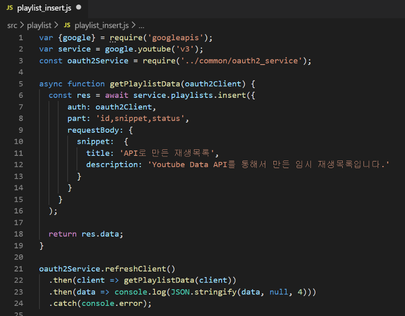 2. 새로운 재생목록을 추가해 보자. "API로 만든 재생목록"이라는 제목으로 비공개 재생목록을 만드는 코드를 아래와 같이 작성한다.
