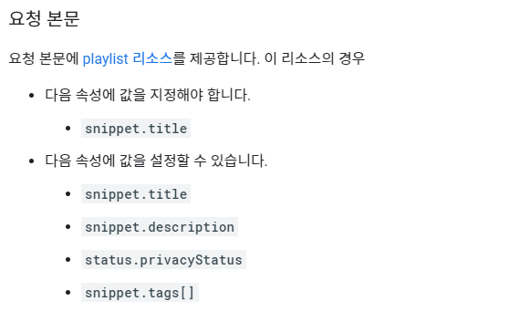 지원 가능한 requestBody 속성 3. 실행결과 아래와 같이 내 재생목록에 'API로 만든 재생목록'이 추가된 걸 확인할 수 있다.