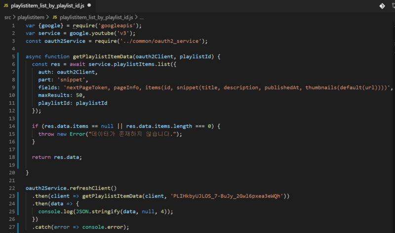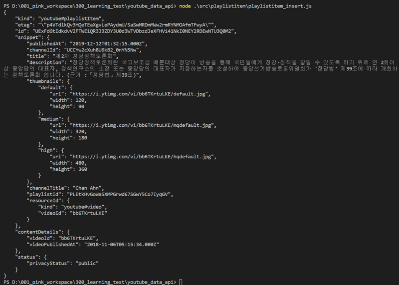 Youtube 라이브러리 문서 for NodeJs 3. 결괏값을 확인한다.