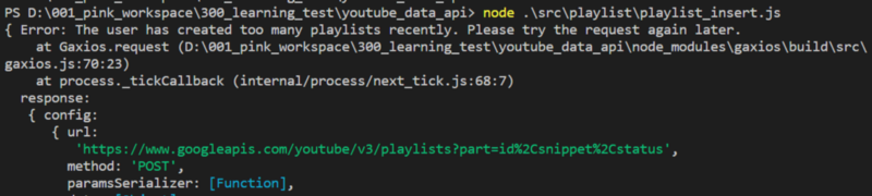 하나의 계정에 재생목록 생성 API 호출을 에 지속적으로 하면, 재생목록 너무 많이 만들었으니 잠시 후에 시도하라고 에러 메시지를 반환한다;;;; 정도껏 하자 -0-;
