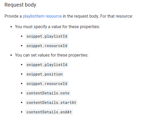 playlistItems.insert() 메서드의 인자로 requestBody를 설정할 수 있다. snippet의 하위 속성인 playlistId와 resourceId 속성 값을 설정하면 해당 내용으로 재생목록에 영상이 추가된다. resourceId 속성은 하위 속성으로 kind와 videoId 값을 설정해야 한다.(kind 속성 빼먹지 말자! 필자는 고생했다 -_ -;;)