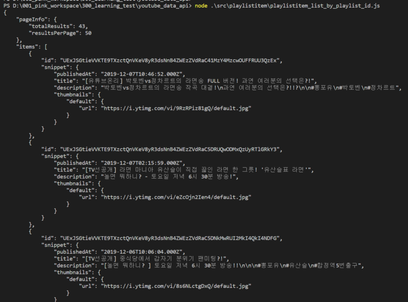 시나리오. '놀면뭐하니?' 채널의 '뽕포유' 재생목록에 들어있는 영상들의 정보(아이디, 제목, 설명, 등록일시 그리고 대표 이미지)를 출력한다.