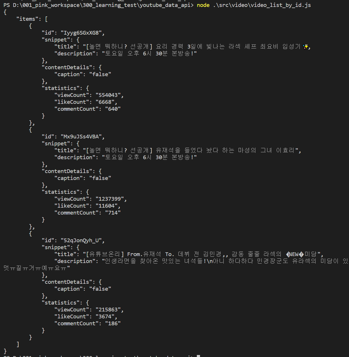 3. videos:list 메서드의 인자로 2번에서 조회한 영상의 아이디를 넘겨주고 영상의 정보(제목, 설명, 조회수, 댓글 수, 좋아요 수, 자막 제공 여부)를 받아와 출력한다.